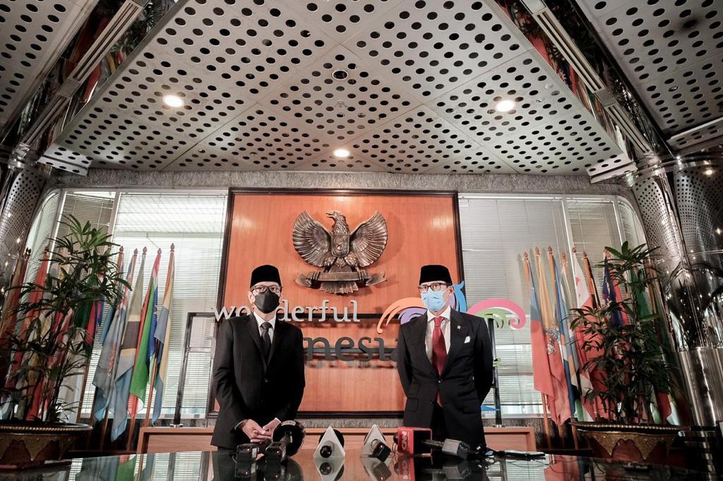 Serah terima jabatan dilakukan oleh Menteri Pariwisata dan Ekonomi Kreatif/Kepala Badan Pariwisata dan Ekonomi Kreatif periode 2019-2020 Wishnutama Kusubandio kepada Menteri Pariwisata dan Ekonomi Kreatif/Kepala Badan Pariwisata dan Ekonomi Kreatif periode 2020-2024, Sandiaga Salahuddin Uno.