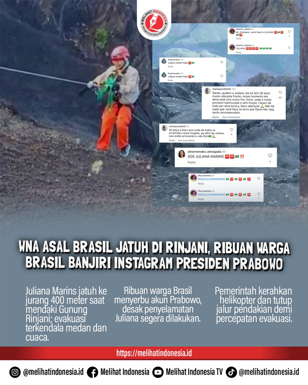 Komentar seperti “SOS JULIANA”, “Onde está Juliana?” dan “Seorang turis Brasil telah menunggu penyelamatan selama lebih dari 50 jam di negara tempat Anda menjadi presiden. Apakah mungkin untuk membantu dan melakukan sesuatu tentang hal itu?” terlihat mendominasi unggahan @prabowo dan @presidenrepublikindonesia, meskipun postingan tersebut membahas lawatan Presiden Prabowo ke Rusia.